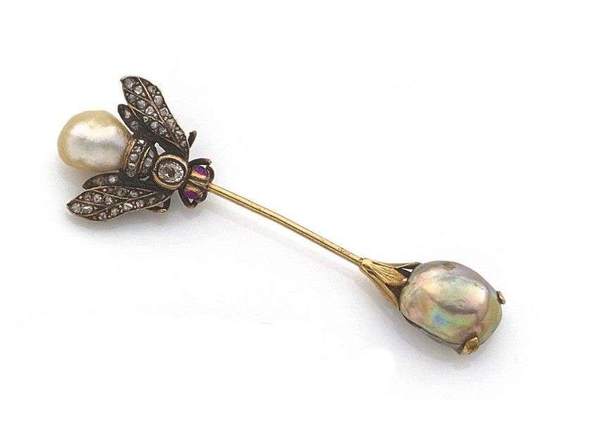 Ensemble composé d'une épingle à jabot en or jaune ornée d'un insecte serti de perles baroques et de diamants taillés en rose. En l'état - Long: 5.5 cm - Poids brut: 5.6gr On y joint un face à main en écaille rehaussé d'un monogramme en argent serti de diamants taillés en rose. En l'état - Long: 24 cm A baroque pearl, diamond and yellow gold pin and a scale, diamond and silver lorgnette.