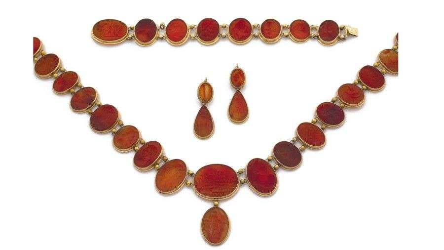 Parure en or jaune 18k composée d'un collier, un bracelet et une paire de pendants d'oreilles ornés d'intailles sur agate brune. Epoque XIXème. Poids brut: 77.9gr A brown agate and yellow gold finery (necklace, bracelet and pair of earrings).