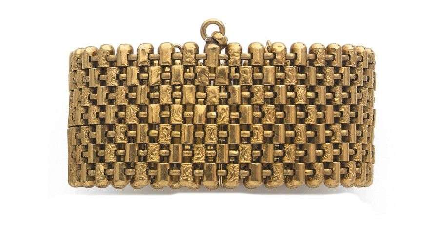 Large bracelet en or jaune 18k articulé de sept rangs de maillons circulaires en partis ciselés. Epoque XIXème. Larg.: 3.5 cm - Long.: 18 cm - Poids brut: 94.5gr A yellow gold bracelet.
