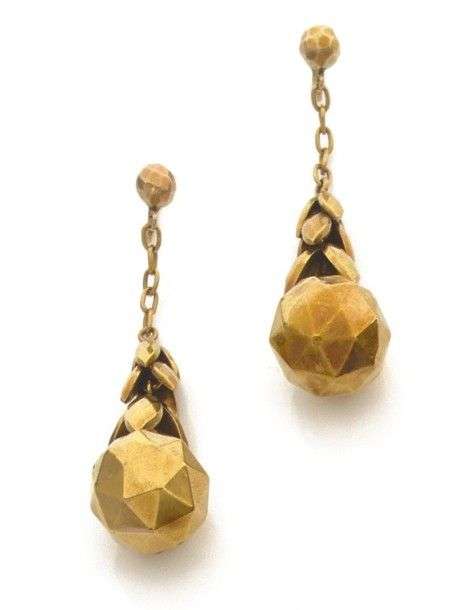 Paire de pendants d'oreilles en or jaune 14k retenant une boule facettée.