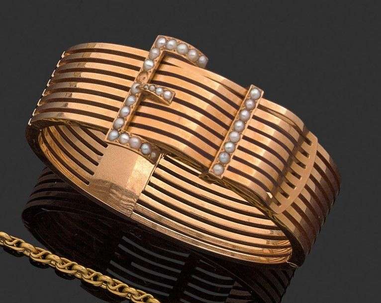 Bracelet jonc ajouré en or jaune 18k à décor d'une boucle de ceinture rehaussée de petites perles. Epoque Napoleon III Diamètre: 6.5 cm - Poids brut: 45.1 gr - Manque et accidents A pearl and yellow gold bracelet.