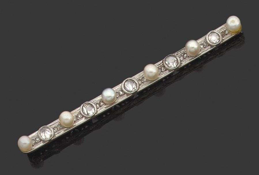 Broche "barette" en or jaune et gris 18k sertie d'une ligne de diamants taillés en rose alternés de petites perles probablement fines. Long: 7.5 cm - Poids brut: 8.34gr A fine supposed pearl, diamond, white and yellow gold brooch.