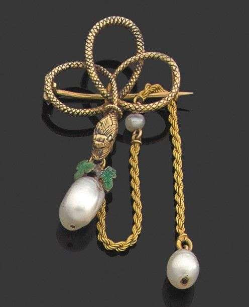 Petite broche "serpent" en or jaune retenant en breloque une perle baroque probablement fine rehaussé de feuilles émaillés. Poids brut: 7.48gr A baroque supposed pearl, enamel and yellow gold brooch.