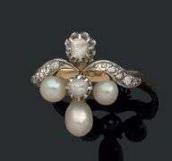 Ensemble composé d'une bague en or jaune et gris 18K sertie de perles fines et de diamants taillés en rose et d'un collier composé d'une chute de petites perles fines. Fermoir baton en or gris serti de diamants taillés en rose. Diam des perles du collier: 1.8 - 4.7 mm env Tour de doigt: 50- Poids brut: 7gr A fine pearl, diamond, white and yellow gold ring and fine pearl, diamond and white gold necklace.