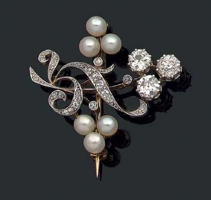 Broche-pendentif en or jaune et gris 18k sertie de diamants de taille ancienne et de perles de culture. Poids brut: 7.89gr A cultured pearl, diamond, white and yellow gold brooch-pendant.