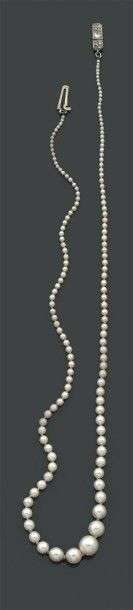 Collier composé de 136 perles fines et 11 perles de culture en chute. Fermoir en or gris serti de brillants. Poids brut: 7.73gr Accompagné d'un certificat du LFG N°308126 attestant perles fines et précisant la position des perles de culture. Diam: 1.5 à 7.3 mm env. A fine pearl, cultured pearl and diamond necklace.