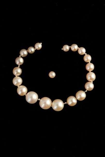 Rang de 17 perles fines et 3 perles de culture en chute. Poids brut: 4.68gr Accompagné d'un certifcat LFG N°309538 attestant perles fines et précisant la position des perles de culture. Diam des perles fines 3.9 - 7.1 mm env Diam: 3.9 - 7.3 mm env A fine pearl and cultured pearl necklace. Lot visible sur www.aguttes.com