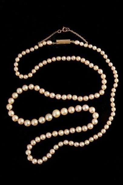 Collier de 122 perles supposées fines en chute - non testées. Fermoir baton en or jaune 18k. Poids brut:14.4gr - Diam: 3.1 - 6.5 mm env A fine supposed pearl and yellow gold necklace. Lot visible sur www.aguttes.com