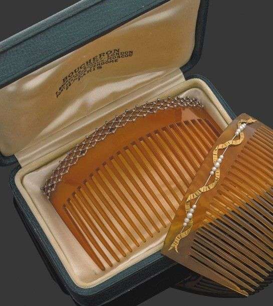 Peigne en corne blonde rehaussé d'un tressage en or gris 18k serti de brillants. Dans un écrin BOUCHERON - Long: env. 10 cm A fair horn, diamond and white gold comb.