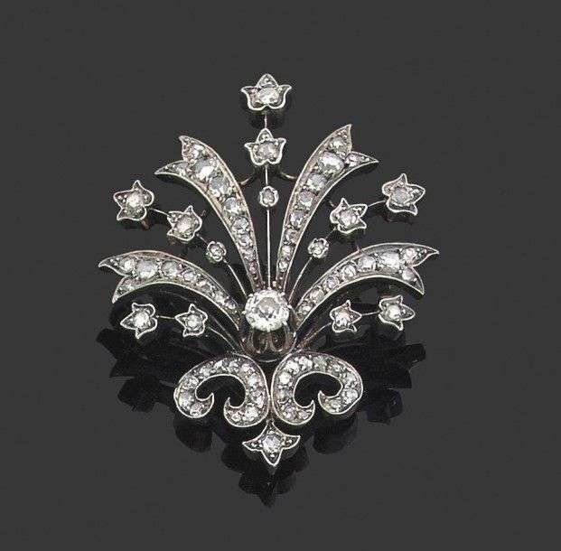 Broche "artifice" en or jaune 18k et argent sertie de diamants taillés en rose et un diamants de taille ancienne au centre. Epoque XIXème. Dans un écrin René Boivin - Poids brut: 13.10gr A diamond, silver and yellow gold brooch.