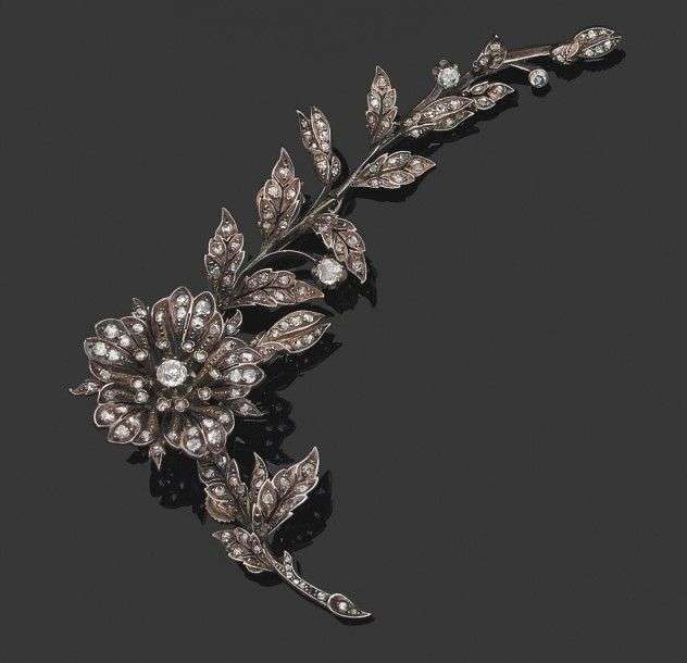Eléments de broche dite "trembleuse" en or jaune 18k et argent, "fleur et feuillage" sertis de diamants de taille ancienne et taillés en rose. Epoque XIXème. Poids brut: 25.1gr. A diamond, silver and yellow gold brooch.