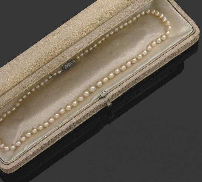 Collier composé de 75 perles fines en légère chute. Fermoir baton serti de