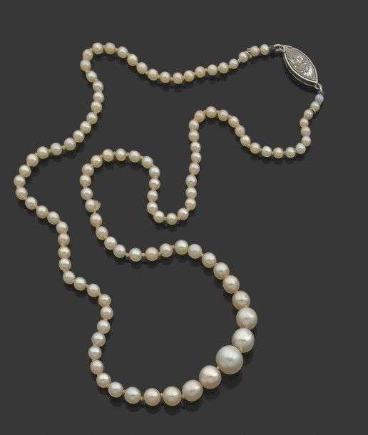Collier composé de 108 perles fines et 4 perles de cultures en chute. Fermoir navette en or gris serti de diamants. Poids brut:11.2gr Accompagné d'un certifcat LFG N°309537 attestant perles fines et précisant la position des perles de culture. Diam: 2.6 - 8.1mm env A fine pearl, cultured pearl, diamond and white gold necklace.