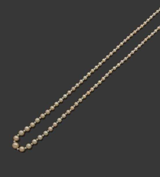 Sautoir composé de 110 perles fines en chute avec intercalaires. Fermoir baton en or jaune. Poids brut: 21.54 gr Accompagné d'un certificat du LFG N° 309925 attestant perles fines. Diam: 3.6 à 8 mm env. A fine pearl and yellow gold necklace.
