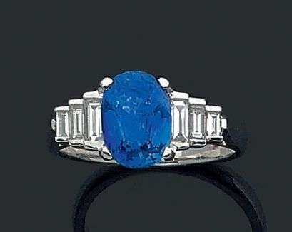 Bague en or gris 18k sertie d'un saphir de taille ovale épaulé de diamants de taille baguette en chute. Poids du saphir: 2.40 cts env. Tour de doigt: 53 - Poids brut: 5 gr A sapphire, diamond and white gold ring.