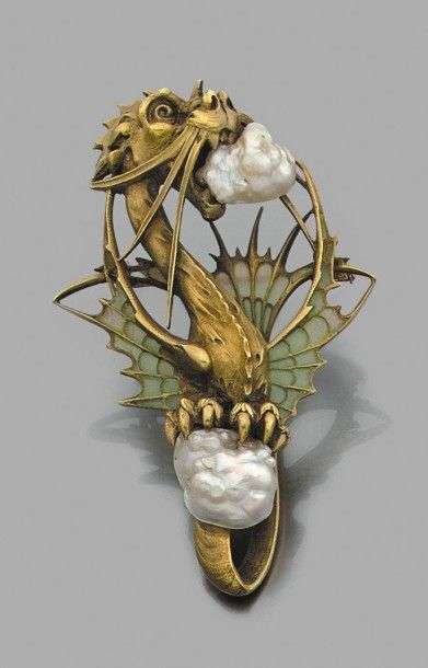 Important pendentif "dragon" ciselé en or jaune 18k serti de deux perles fines baroques, les ailes à décor d'émail plique à jour. Vers 1900. Travail français. Peut se porter en broche également. Haut: 6.7 cm - Poids brut: 42.9gr A baroque fine pearl, enamel and yellow gold pendant.