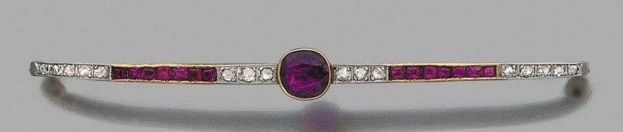 Grande broche "barette" en or jaune 18k sertie de rubis et de diamants de taille ancienne. Vers 1925. Long.: 8.2cm - Poids brut: 7.10gr A ruby, diamond and yellow gold brooch.