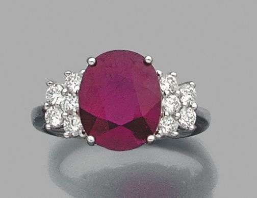 Bague en or gris 18k sertie d'un important rubis ovale épaulé de diamants de taille brillant. Poids du rubis: 4.66 cts env. Tour de doigt: 53 - Poids brut: 5.25 gr A ruby, diamond and white gold ring.
