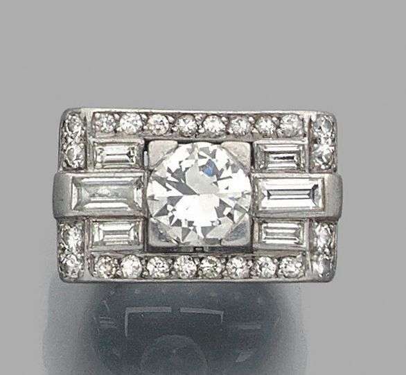 Bague chevalière en platine sertie d'un diamant de taille moderne épaulé de diamants baguettes dans un entourage de diamants de taille brillant. Vers 1935. Poids du diamant: 1.95 cts env. Tour de doigt: 51 - Poids brut: 14.6gr A diamond and platinium ring.