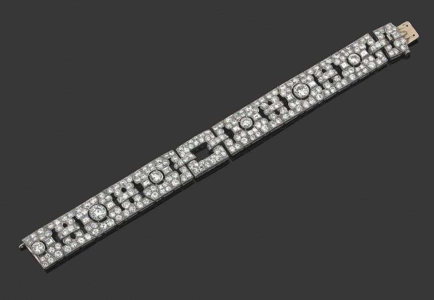 Bracelet articulé en platine et or gris 18k composé d'un décor ajouré serti de diamants de taille brillant et de baguette. Vers 1920. Long.: 17cm - Poids brut: 39gr A diamond, platinium and white gold bracelet.