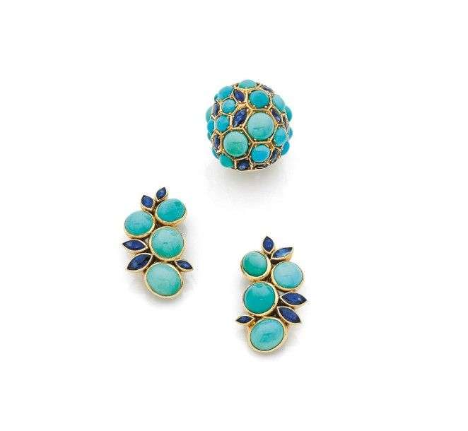 Importante bague « boule » en or jaune sertie de cabochons de turquoises et de saphirs de forme navette. Poinçon de maître Groëne and Darde. Tour de doigt: 51 - Poids brut: 19gr Collection particulière. Acquis en décembre 1954 chez Herz - Belperron et conservée dans la famille depuis. Accompagnée d'un certificat de Monsieur Olivier Baroin Bague similaire par son dessin reproduite dans l'ouvrage "Suzanne Belperron" par Sylivie Raulet et Olivier Baroin page 251 Vendue avec faculté de réunion avec lot 119 A turquoise, sapphire and yellow gold ring by Suzanne Belperron.