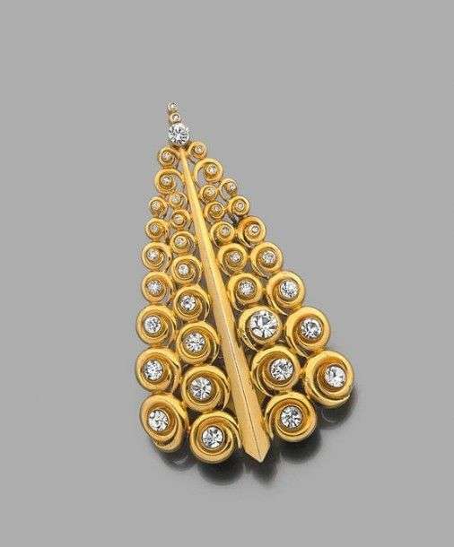 Grand clip « Chinois » en platine et or gris (doré) 18k à décor d'enroulements rehaussés de strass et de diamants. Poinçon de maître Gröene and Darde. Haut.: 6.5cm env - Poids brut: 21.9gr Collection particulière. Acquis en mars 1950 chez Herz - Belperron et conservé dans la famille depuis. Accompagné d'un certificat de Monsieur Olivier Baroin précisant que ce clip était en or gris serti de diamants. Modifications postérieurs. A diamond, glitter, platinium and white gold brooch by Suzanne Belperron.