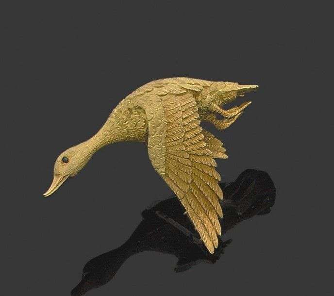 Broche "canard sauvage" en or jaune 18k ciselé. Poinçon de maître. Haut.: 3 cm - Larg.: 4.5 cm - Poids brut: 16 gr A yellow gold brooch by Georges Lenfant.