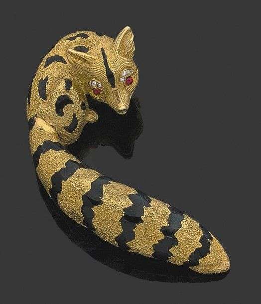 Clip "félin" en or jaune 18k et émail noir rehaussé de rubis et brillants sur les yeux. Signé et numéroté. Vers 1970 Long.: 5.5 cm - Poids brut: 21g - Léger manque d'émail A black enamel, ruby, diamond and yellow gold brooch by Van Cleef & Arpels.