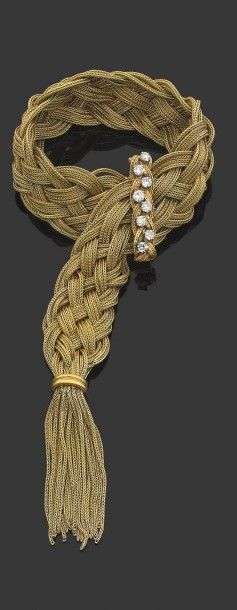 Bracelet "ceinture" en or jaune 18k tressé, formant à l'extrémité un pompon de fils d'or, rehaussé d'un fermoir barette serti de brillants. Signé. Long: 28.5 cm - Poids brut: 93.4 g A diamond and yellow gold bracelet by Regner.