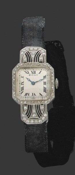 Montre de dame en platine entourage ajouré serti de diamants, bracelet tissu noir. Cadran carré à pans coupés signé Birks. Mouvement Longines Poids brut: 21 gr A diamond and platinium lady's watch.