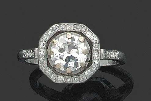 Bague en or gris 18k ornée d'un diamant demi taille dans un entourage ajou