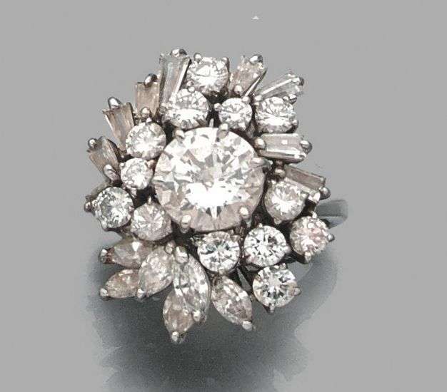 Bague en or gris 18k sertie d'un diamant de taille moderne dans un entourage de diamants baguettes, navettes et brillants. Poids du diamant: 2.65 carats env. Tour de doigt: 52 - Poids brut: 9.15gr A diamond and white gold ring.