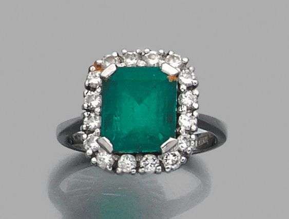 Bague en platine ornée d'une belle émeraude de Colombie dans un entourage