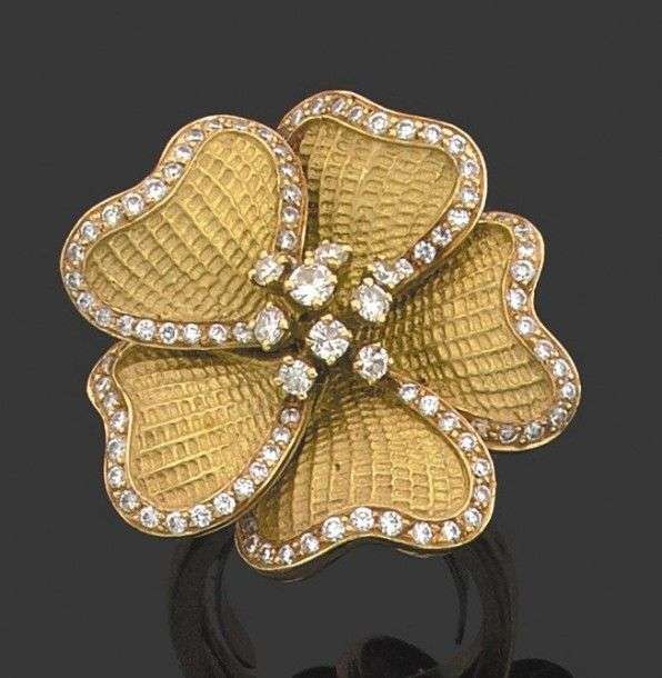 Bague "fleur" en or jaune 18k, les pétales stylisant des coeurs rehaussés de lignes de diamants de taille brillant. Tour de doigt: 56 - Poids brut: 27.5gr A diamond and yellow gold ring.