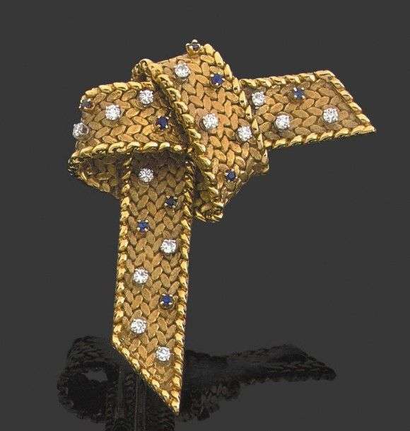 Broche "boucle" formée d'un ruban tressé en or jaune 18k sertie de brillants et de saphirs. Long: 4 cm - Larg: 5.5 cm - Poids brut: 31.1gr A sapphire, diamond and yellow gold brooch.