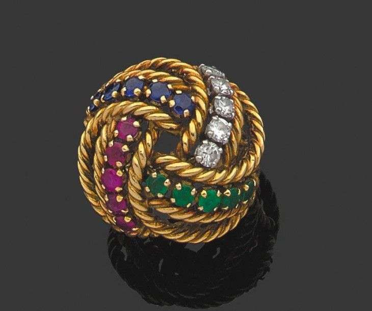 Bague "torsadée" en or jaune 18k rehaussée d'une ligne de rubis, d'émeraudes, de brillants et de rubis. Signée et dans son écrin. Tour de doigt: 48 - Poids brut: 12.4gr A ruby, emerald, diamond and yellow gold ring by Boucheron.