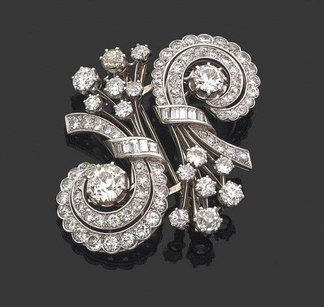 Broche "double clip" en or gris 18k et platine composée de deux volutes serties de diamants de taille ancienne rehaussées de diamants baguettes. Poids des diamants plus importants: 1 et 2 cts env. Haut: 5 cm env - Poids brut: 39gr /Poids diamants:0.99 ct et 2.07 cts env./ A diamond, platinium and white gold brooch.