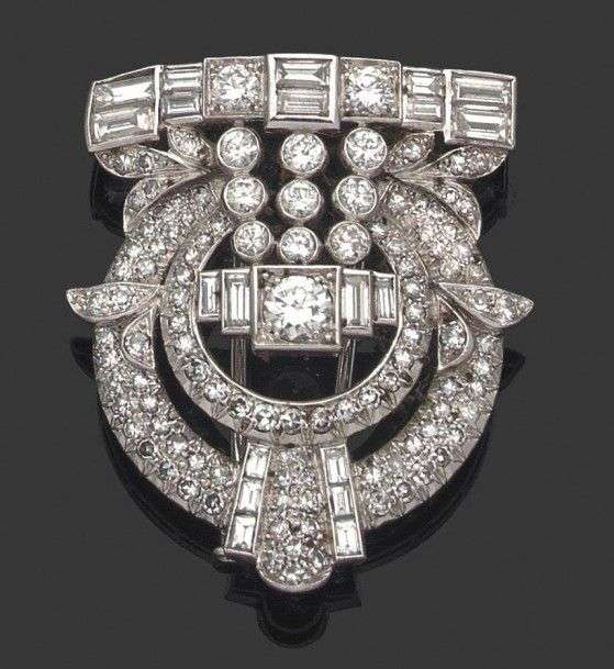 Clip en platine et or gris 18k serti de diamants de taille brillant, taille huit huit et taille baguette. Vers 1940 Haut.: 4 cm env - Poids brut: 25.5gr A diamond, platinium and white gold brooch.