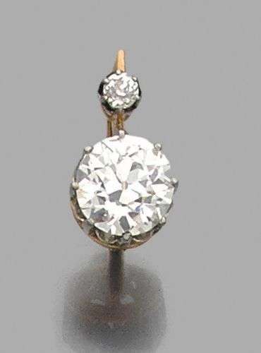 Motif d'oreille en or jaune et gris 18k serti d'un diamant de taille ancienne rehaussé d'un petit brillant Poids du diamant: 2.45 cts env Poids brut: 3.1 gr A diamond and yellow gold earring.