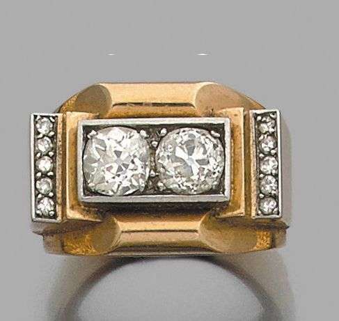 Chevalière en or jaune 18k et platine sertie de deux diamants de taille ancienne épaulés de deux lignes de diamants huit-huit. Vers 1940 Tour de doigt: 56 - Poids brut: 11.54gr A diamond, platinium and yellow gold ring.