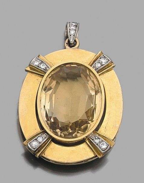Pendentif en or jaune 18k orné d'une citrine dans un entourage rehaussé de barette de brillants. Haut: 5 cm - Poids brut: 18.5 gr A citrine, diamond and yellow gold pendant.