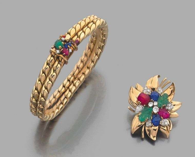 Ensemble "Tutti fruttis" composé d'un clip en platine et or jaune 18k serti d'émeraudes, saphirs et rubis cabochons gravés en feuilles rehaussés de brillants et un bracelet double lien assorti. La broche dans son écrin d'origine. Signés et numérotés. Vers 1955 Diam.: 4 cm - Long du bracelet: 18 cm - Poids brut: 64.82 gr A sapphire, ruby, emerald, diamond, platinium and yellow gold brooch and bracelet by Mauboussin.
