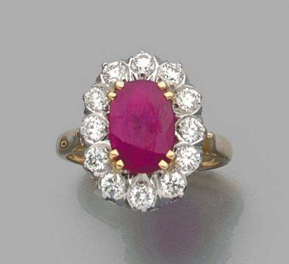 Bague "Pompadour" en or jaune et or gris 18k sertie d'un rubis de taille ovale dans un entourage de diamants de taille brillant. Poids du rubis: 2.83 cts Tour de doigt: 54.5 - Poids brut: 6.85 gr A ruby, diamond, yellow and white gold ring.