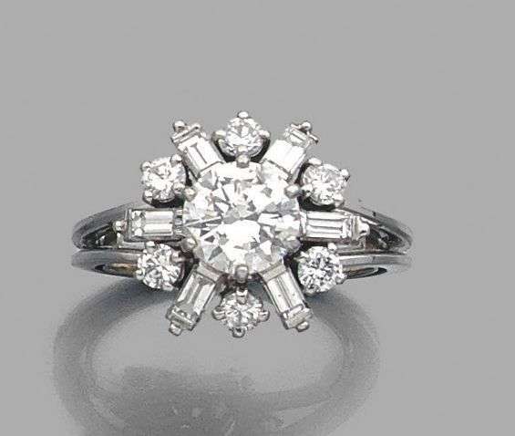 Bague en platine ornée d'un diamant demi taille dans un entourage de diamants de taille baguette et brillants. Poids du diamant central: 1.25 ct env Tour de doigt: 55 - Poids brut: 8 gr A diamond and platinium ring.