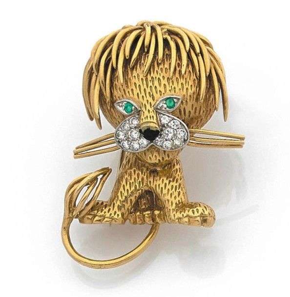 Clip "lion ébouriffé" en or jaune 18k serti de brillants et émail noir sur le museau et d'émeraudes pour les yeux. Signé et numéroté. Vers 1965. Haut.: 4.5 cm - Poids brut: 24.5 g A diamond, black enamel, emerald and yellow gold brooch by Van Cleef & Arpels.