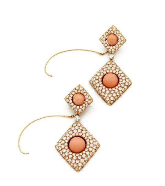 Paire de grands clips d'oreilles or jaune 18k composés de deux motifs losangiques pavés de diamants de taille brillant et rehaussés d'un cabochon de corail au centre. Vers 1970 Signés et numérotés. Dans un écrin. Haut.: env 7.5 cm - Poids brut: 46gr A coral, diamond and yellow gold pair if earrings by Van Cleef & Arpels.