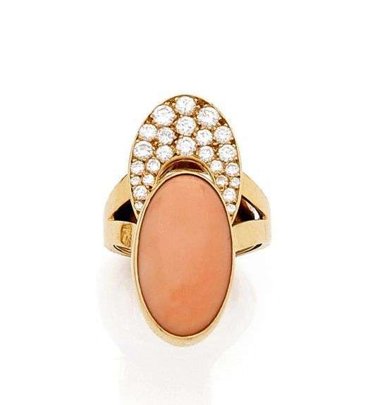 Bague "asymétrique"en or jaune 18k composée d'un motif circulaire ajouré pavé de brillants et surmonté d'un beau cabochon de corail. Signé Cartier Paris. Vers 1970 Tour de doigt: 55 - Poids brut: 11.3gr A coral, diamond and yellow gold ring by Cartier.