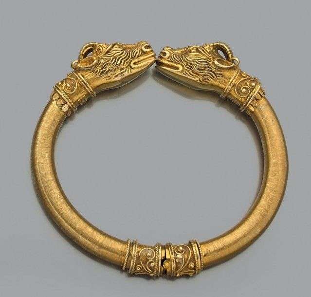 Bracelet jonc en or jaune 18k orné de deux têtes de béliers ciselées. Signé et dans son écrin d'origine avec certificat. Poids brut: 51.2 gr A yellow gold bracelet by Zolotas.