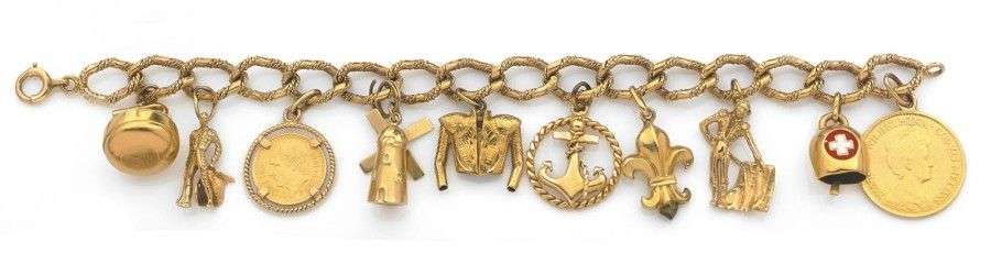 Bracelet articulé en or jaune 18k orné de dix breloques en or ciselé en pa