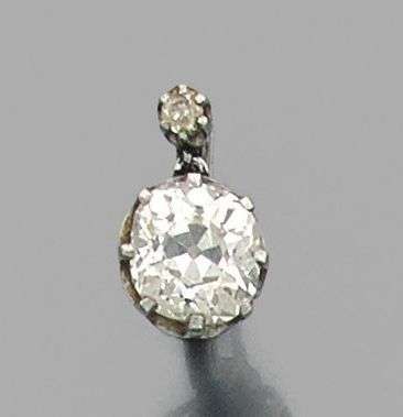 Motif d'oreille en or gris 18k serti d'un diamant de taille ancienne rehaussé d'un petit diamant. Poids du diamant: 1.85 cts env - Poids brut: 2.7gr A diamond and white gold earring.